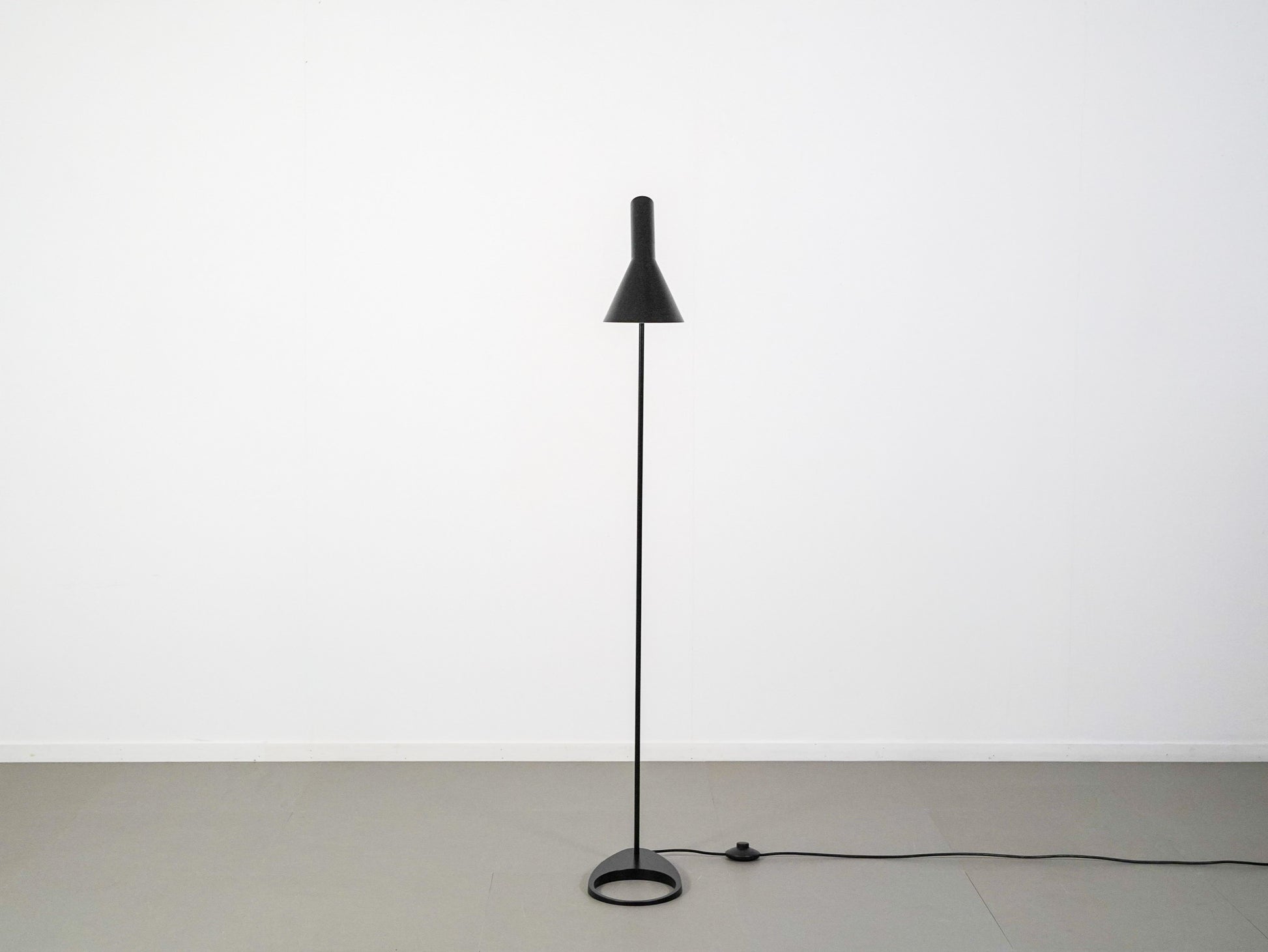 アルネ・ヤコブセンがデザインした「AJフロア」は、デンマークの人気ブランド、ルイス・ポールセンを代表する照明の1つ。今回紹介するのは、2024年製でカラーは一番人気のブラック。