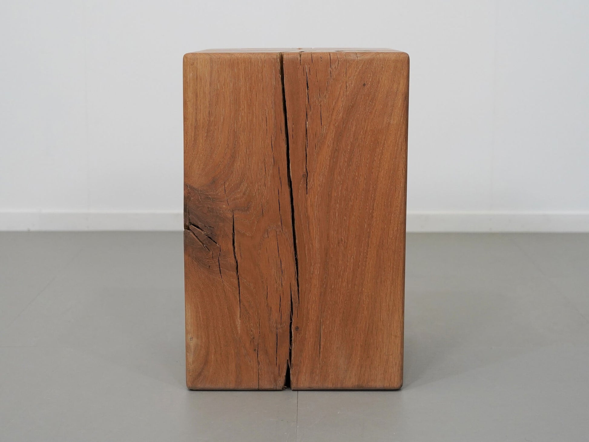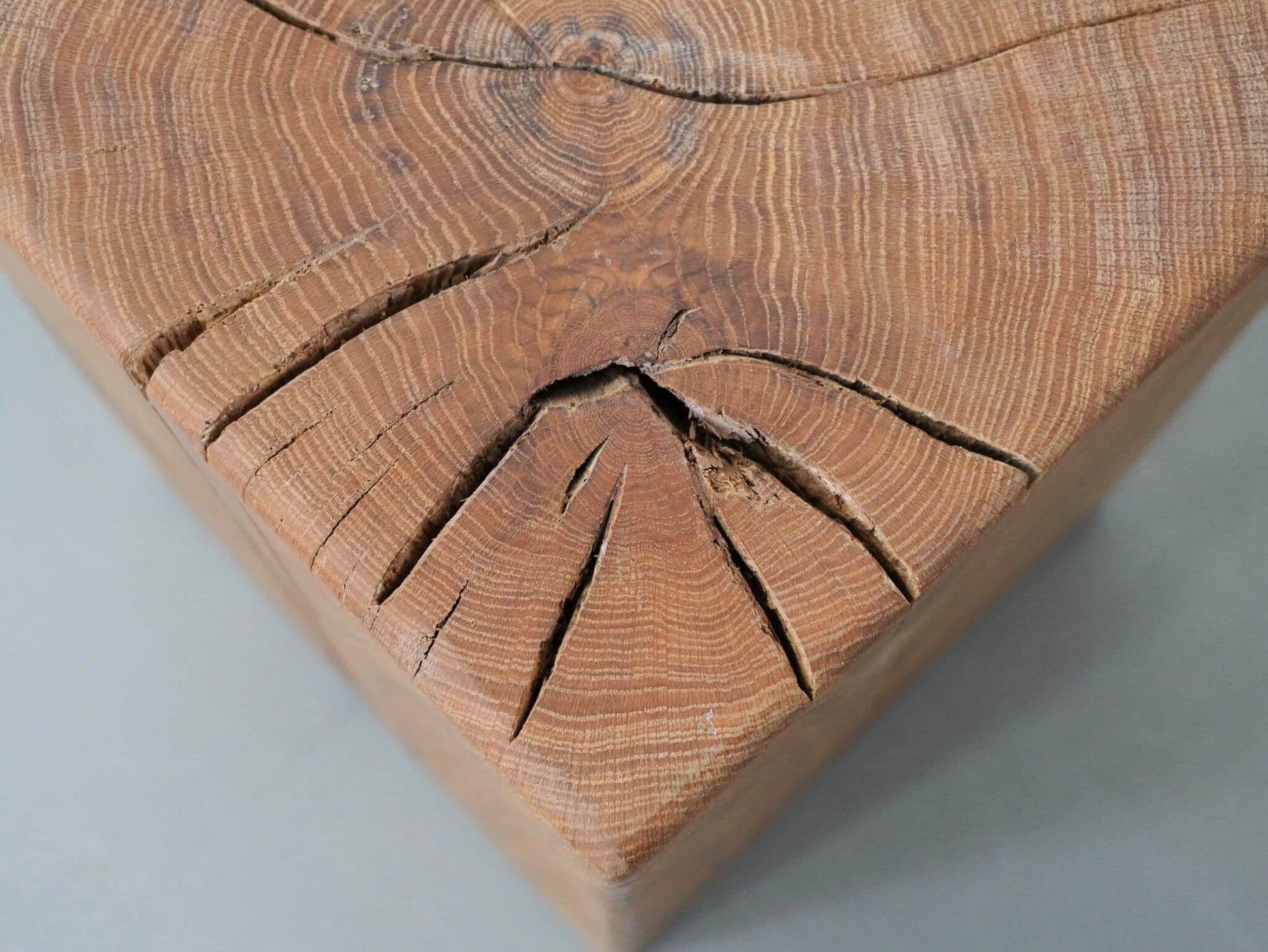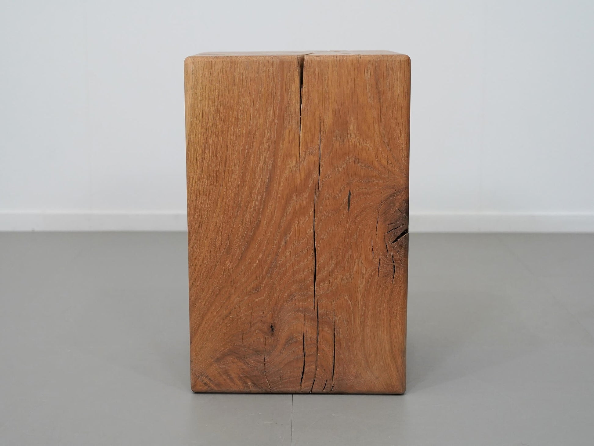 オークの無垢材を大胆に切り出して作られた、重厚感のあるブロックスツール。