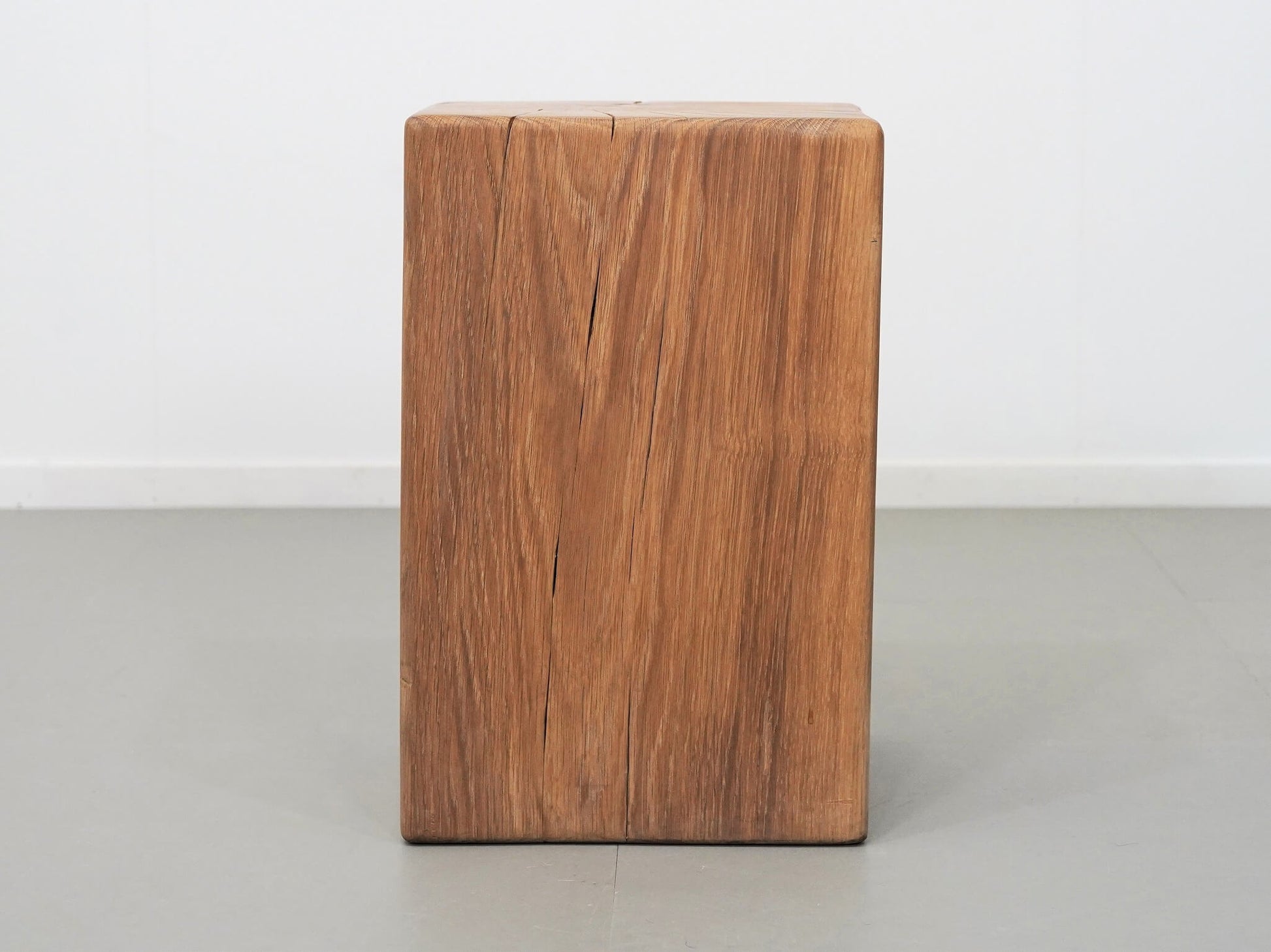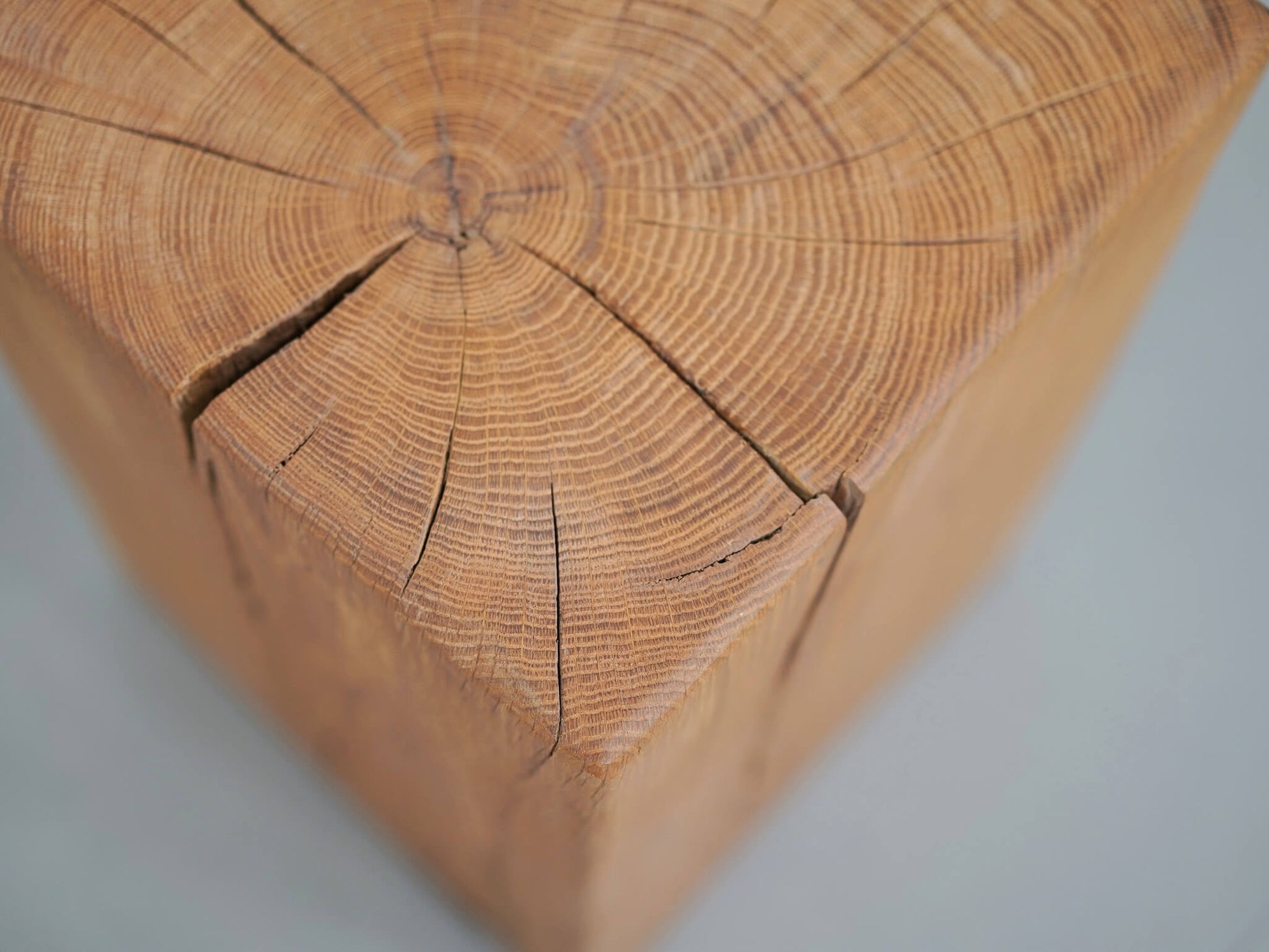 オークの無垢材を大胆に切り出して作られた、重厚感のあるブロックスツール。