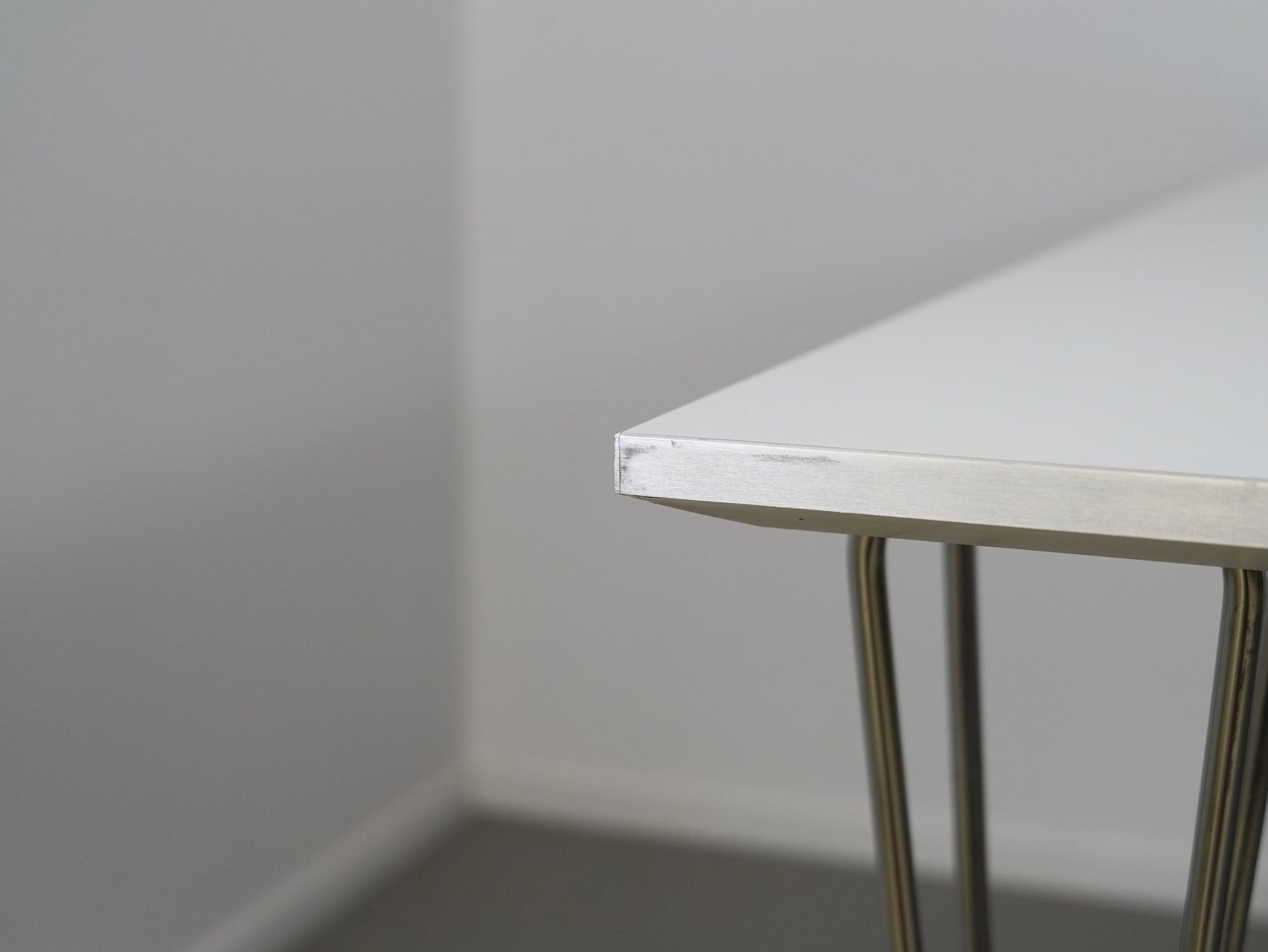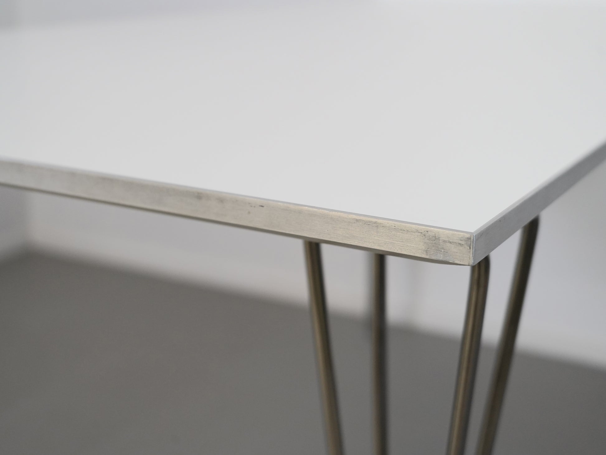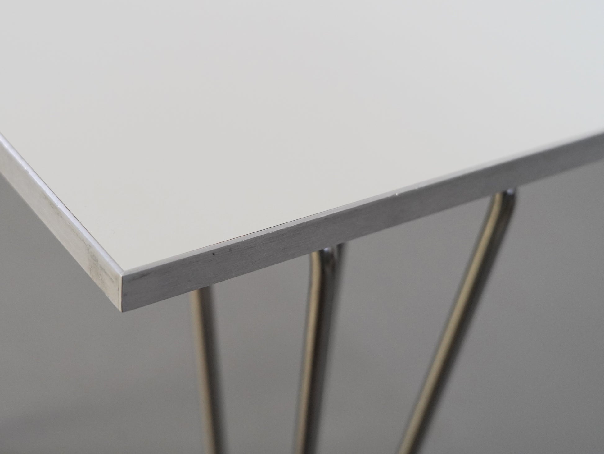 アルミのエッジがシャープな印象を与える長方形の天板はアルネ・ヤコブセンがデザインしたとか。一方、マットソンが手掛けたスパンレッグは、優美な曲線で上品さがあります。