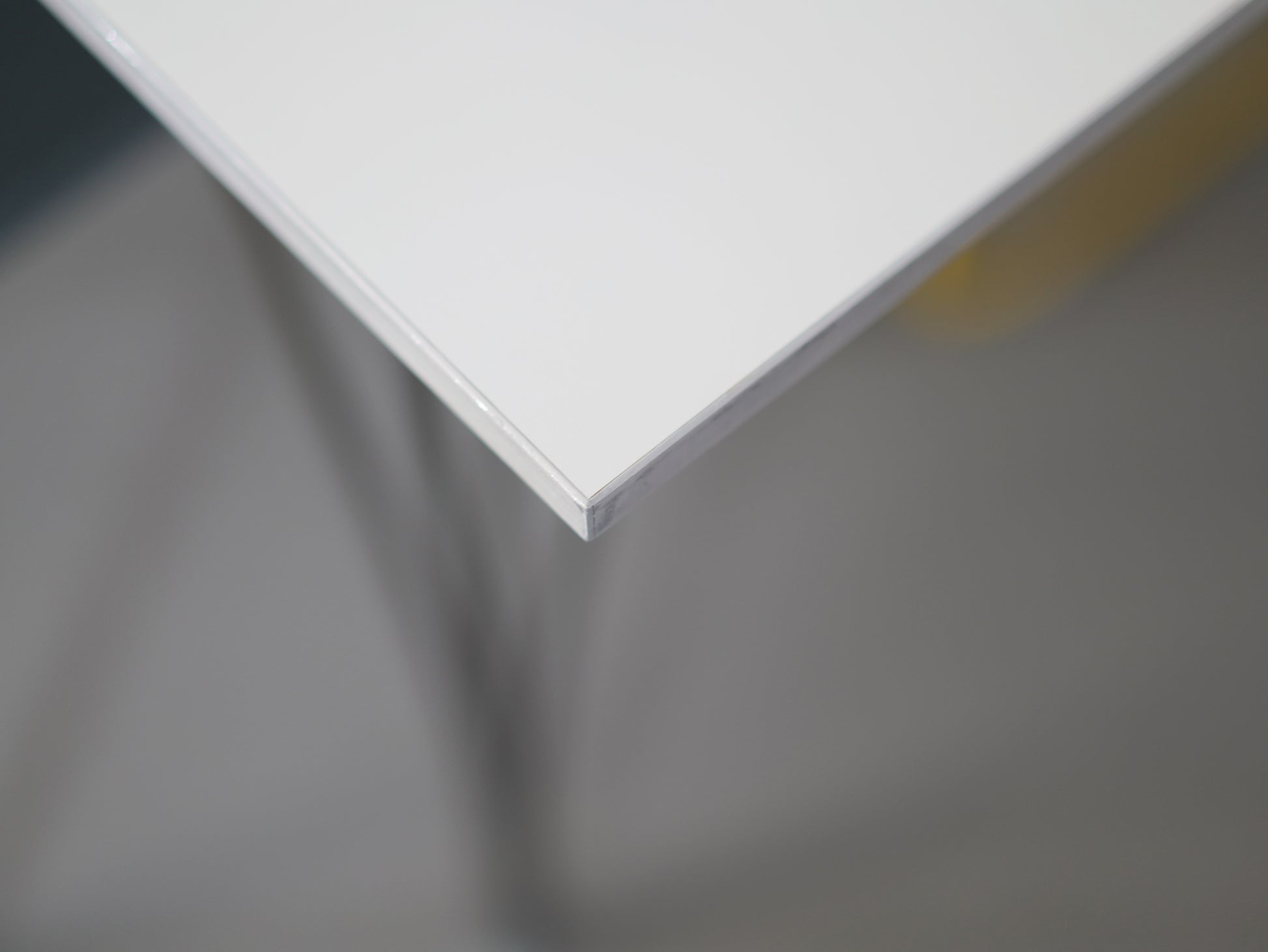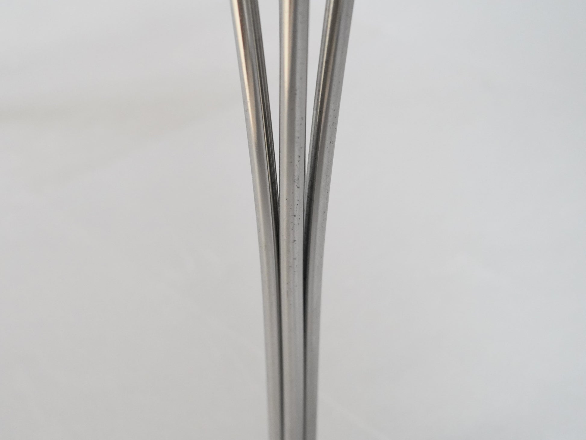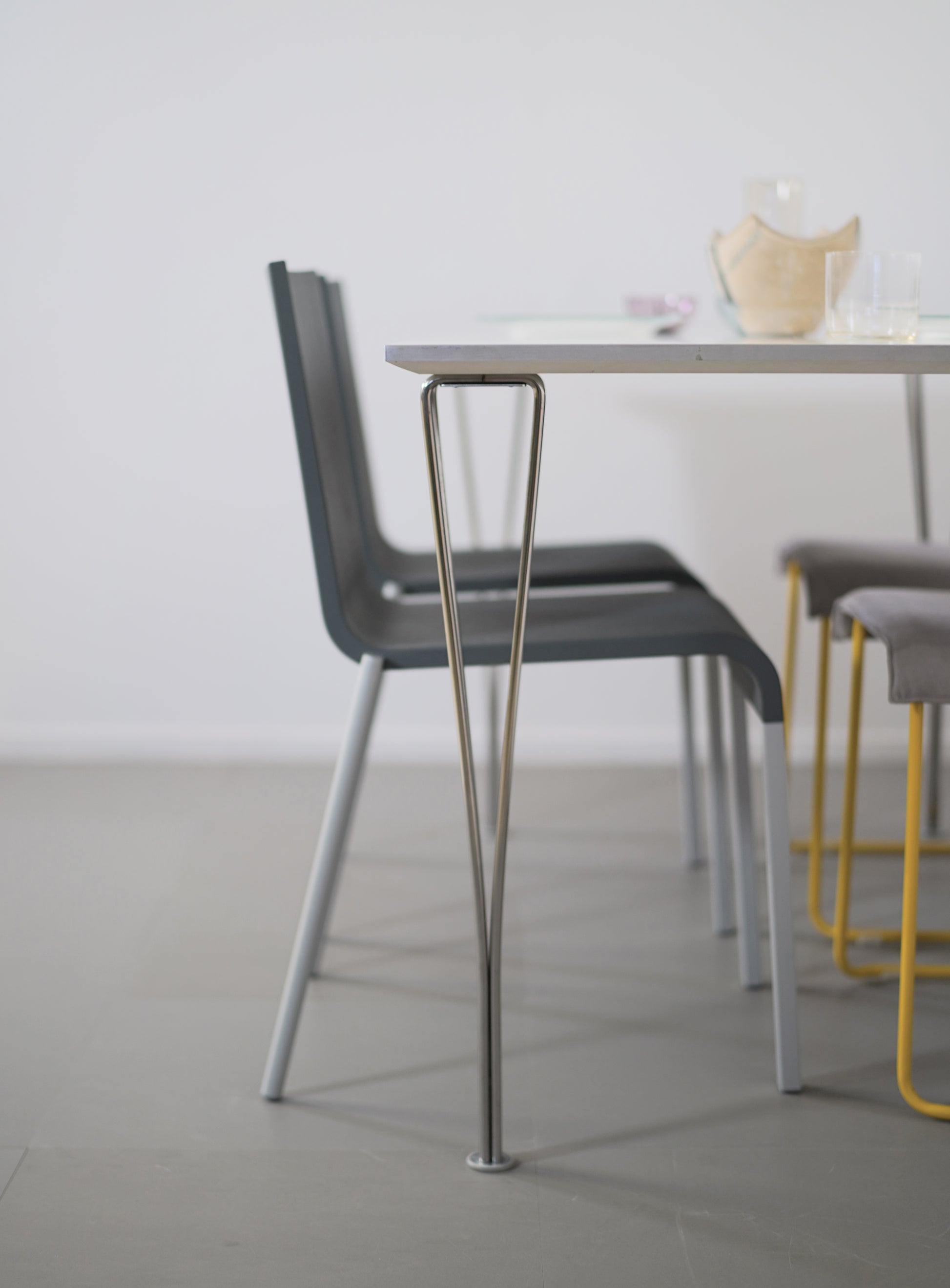 アルミのエッジがシャープな印象を与える長方形の天板はアルネ・ヤコブセンがデザインしたとか。一方、マットソンが手掛けたスパンレッグは、優美な曲線で上品さがあります。