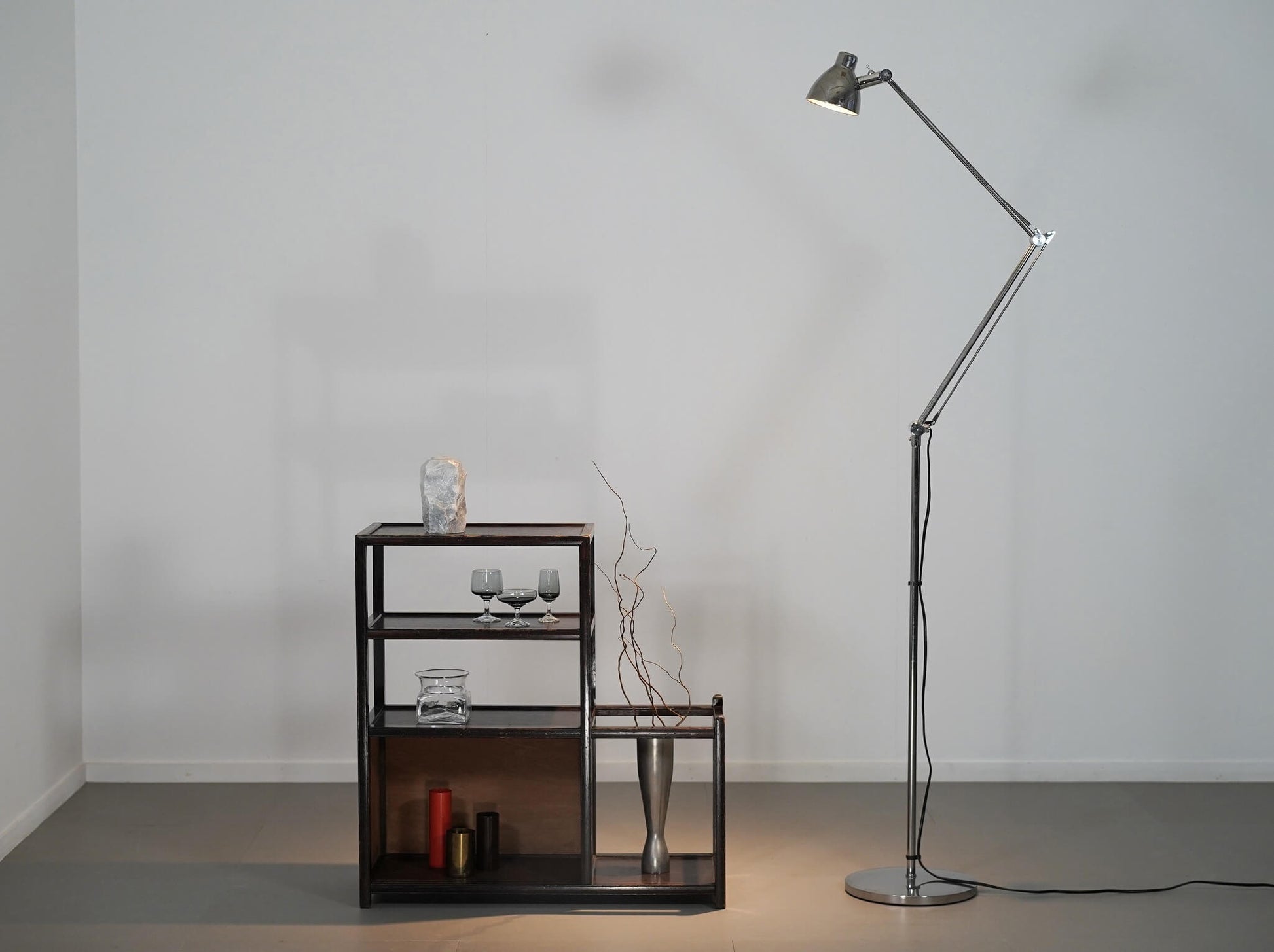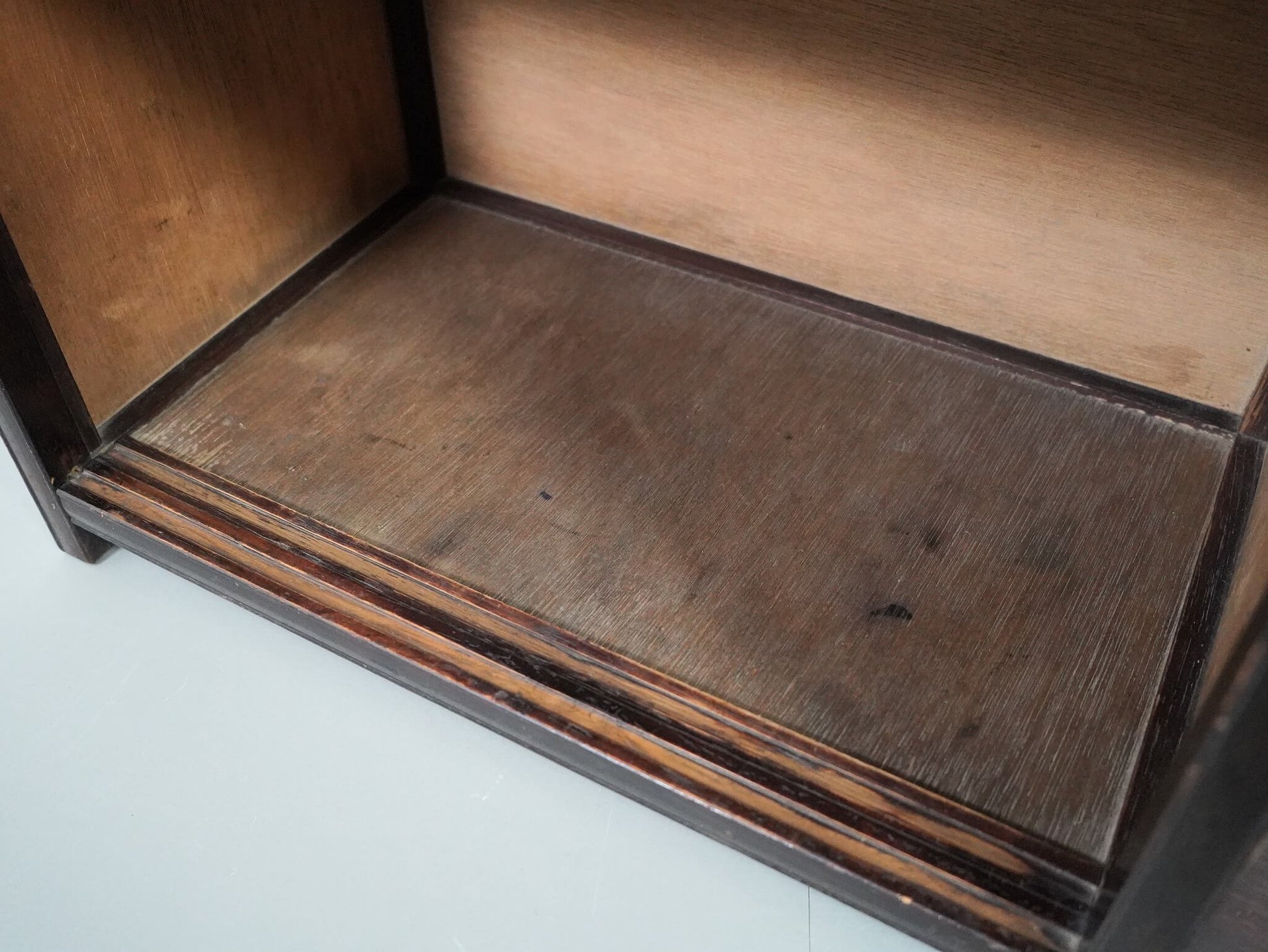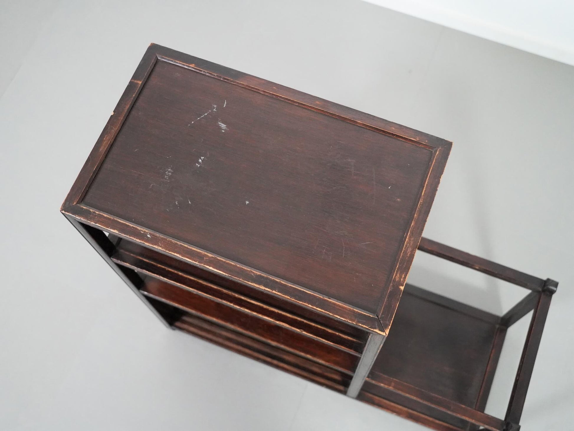 過度な装飾を抑え、直線を基調としたデザインの中に、当時の日本の家具らしい静かなたたずまいを感じます。棚部分と横に張り出したスペースが一体となった、少し珍しいデザインも魅力のひとつ。