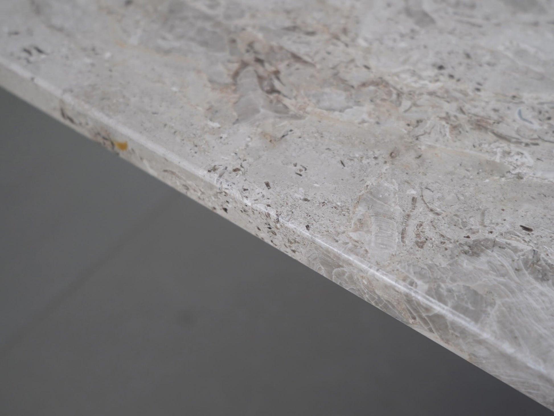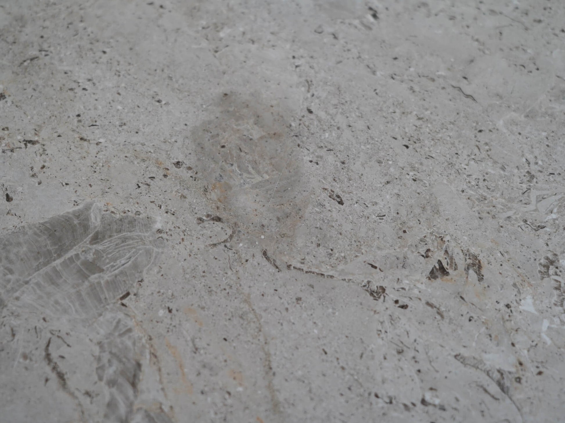 天板の縁にわずかに欠けがありますが、大理石の模様になじんでいるため、極端に目立つものではないように思います。また、光を当てると輪染みや染みが見られますが、通常の使用ではほとんど目立たない程度です。