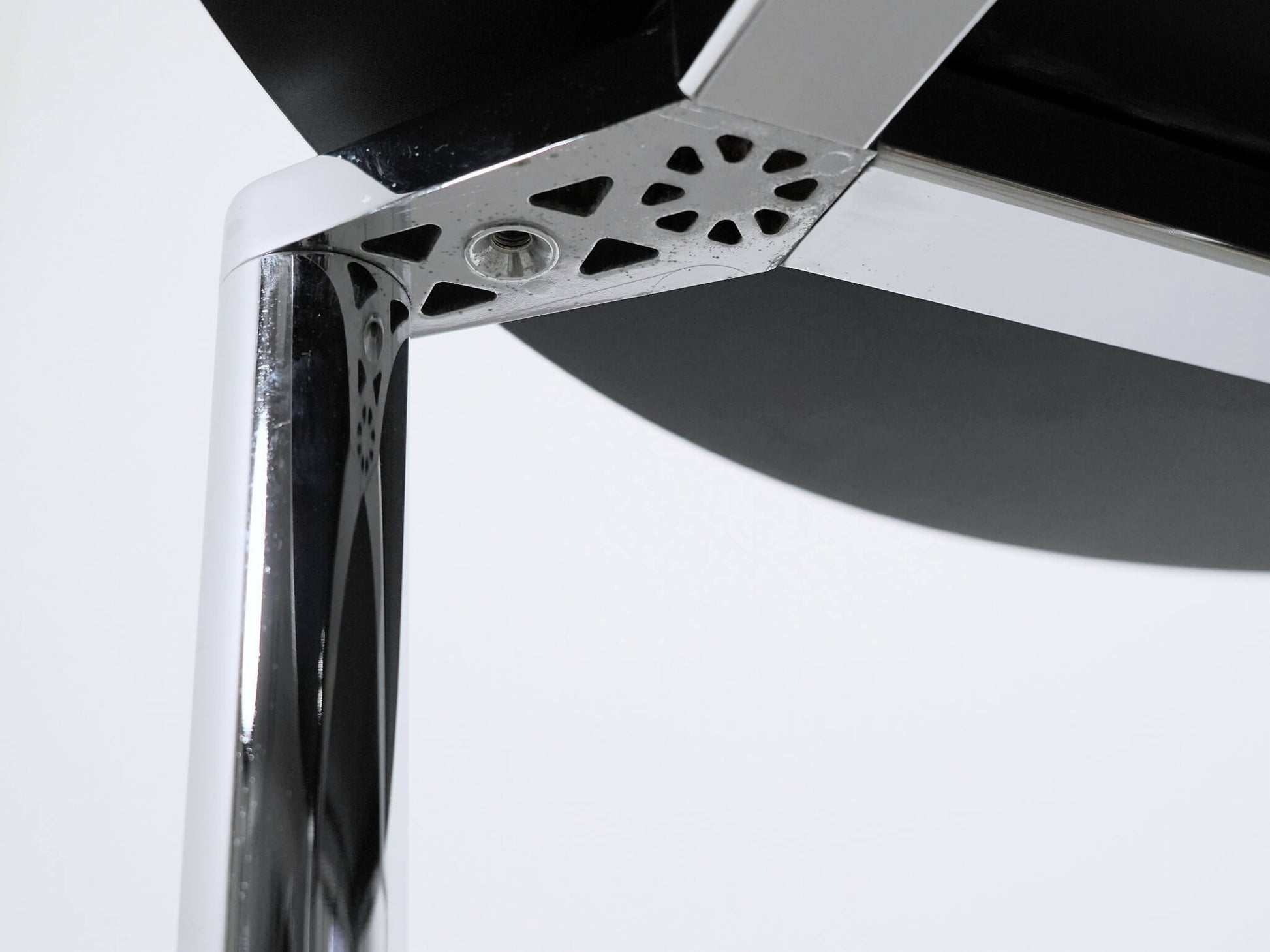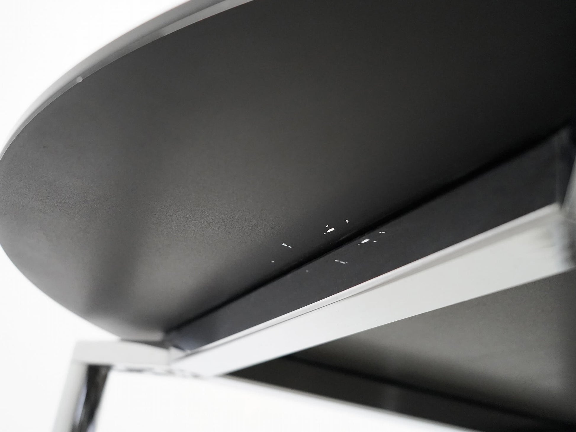 プラーノは非常に薄い天板が宙に浮いているかのような軽やかなデザインが特徴で、建築家らしい構造美が感じられる一台です。天板にはブラックガラス、脚部にはツヤがあるスチール(クローム仕上げ)を採用しており、モダンでスタイリッシュな印象。