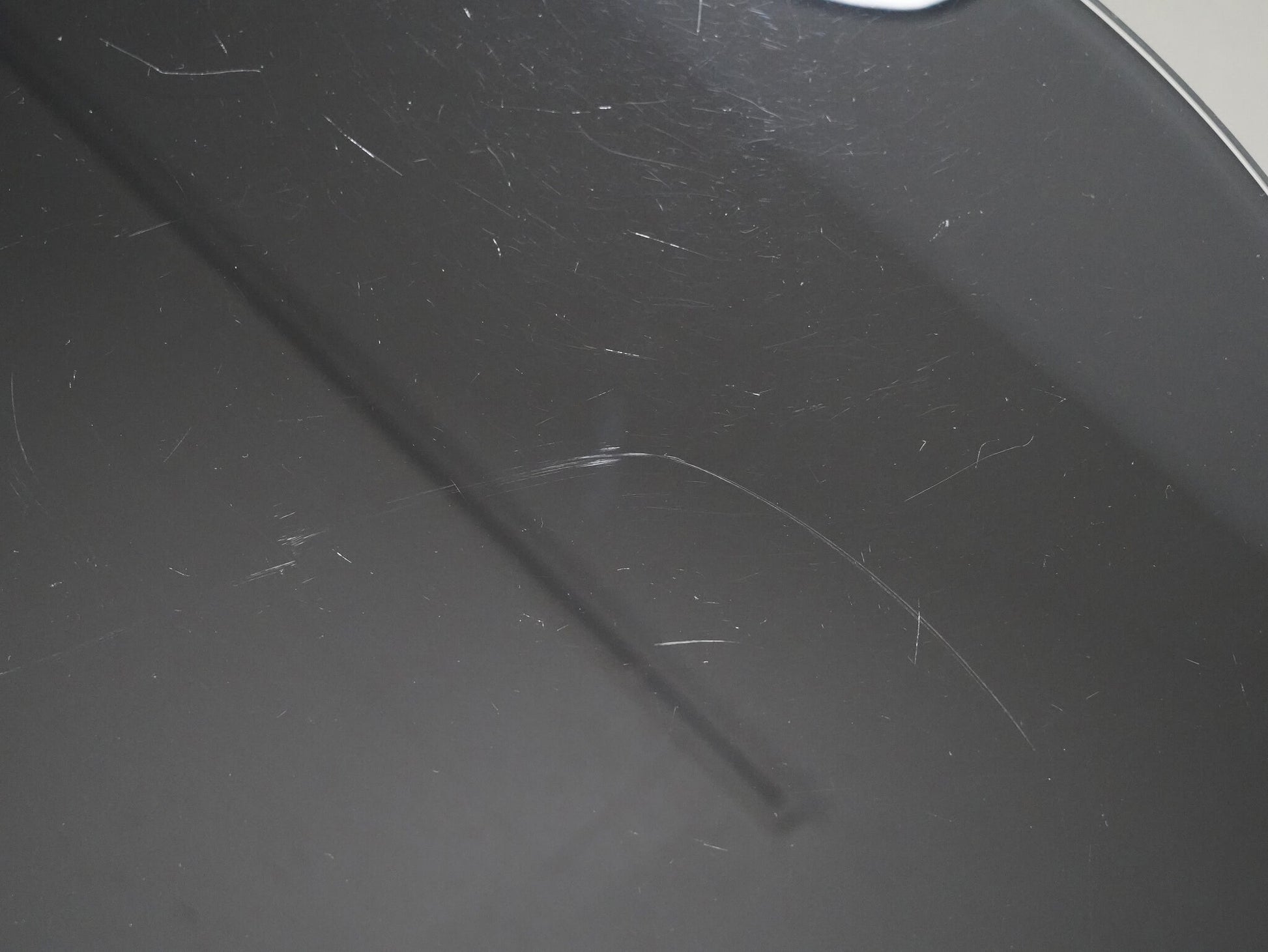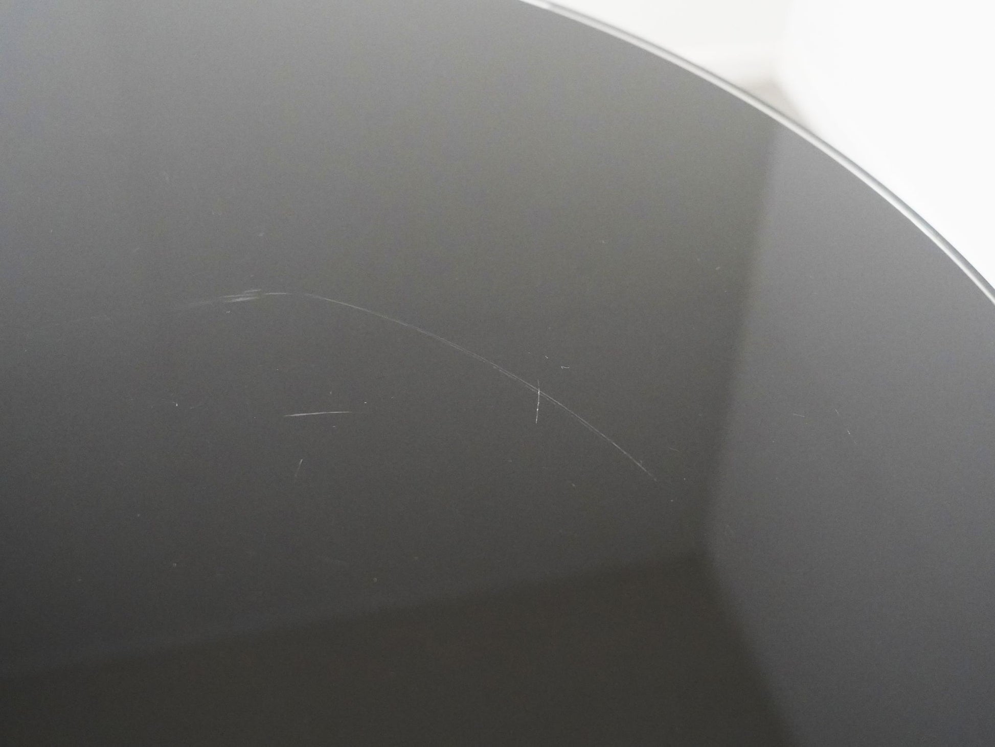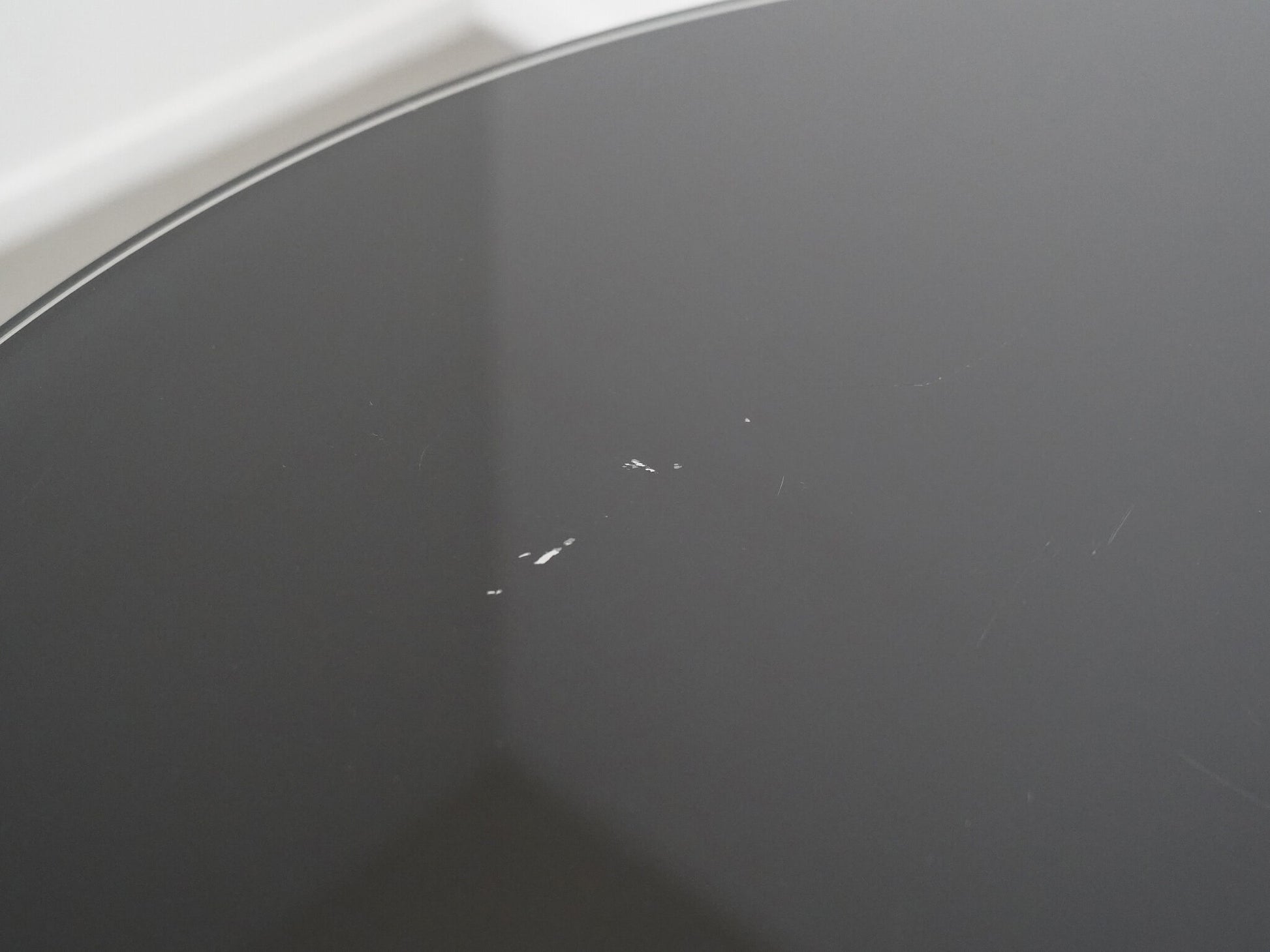 天板には引っかきキズが多く見受けられます。一部白く見える箇所がありますが、天板裏の黒いシートが剥がれていることによるもので、ガラストップ自体が凹んでいるわけではありません。